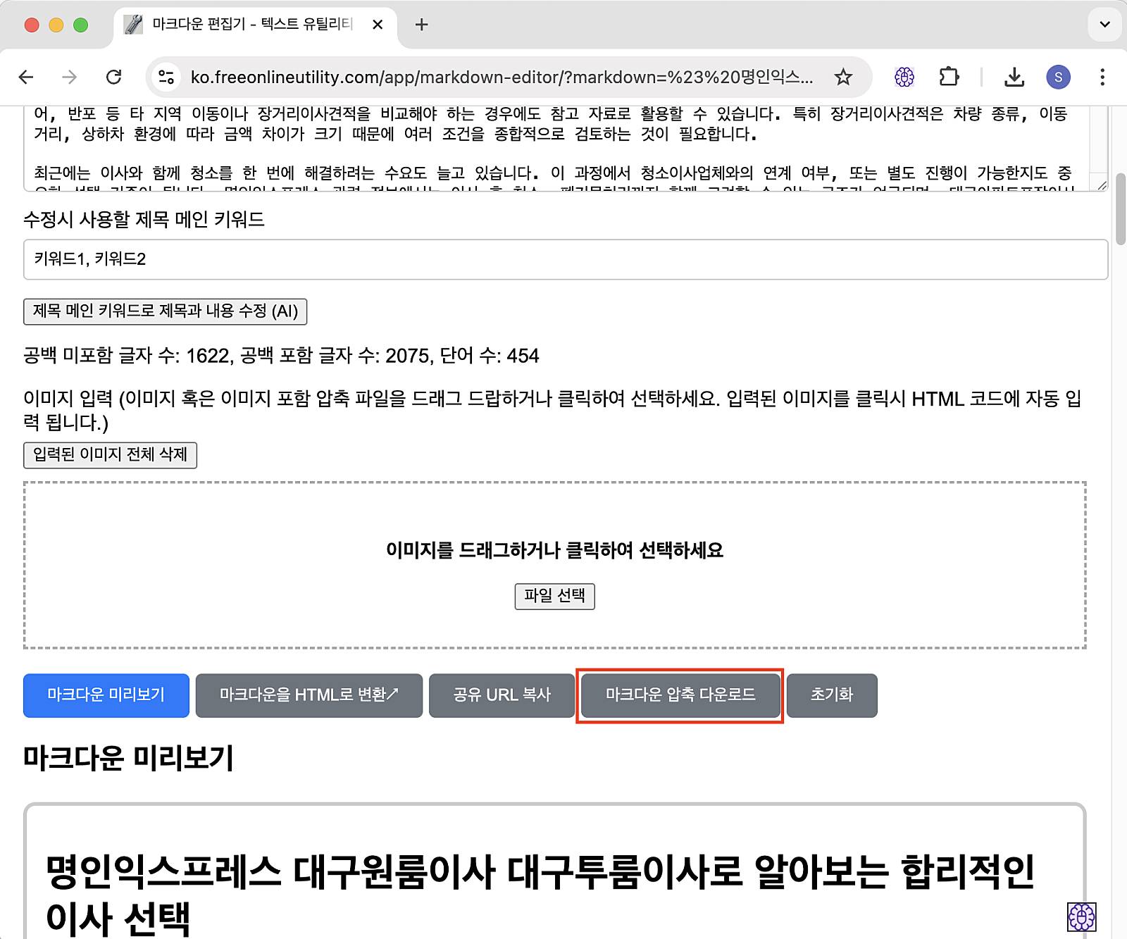 마크다운 편집기에서는 텍스트 수정뿐만 아니라 이미지 삽입도 가능하며, 이미지가 포함된 상태에서 마크다운 압축 다운로드 버튼을 누르면 원고와 이미지가 함께 압축 파일로 저장됩니다.