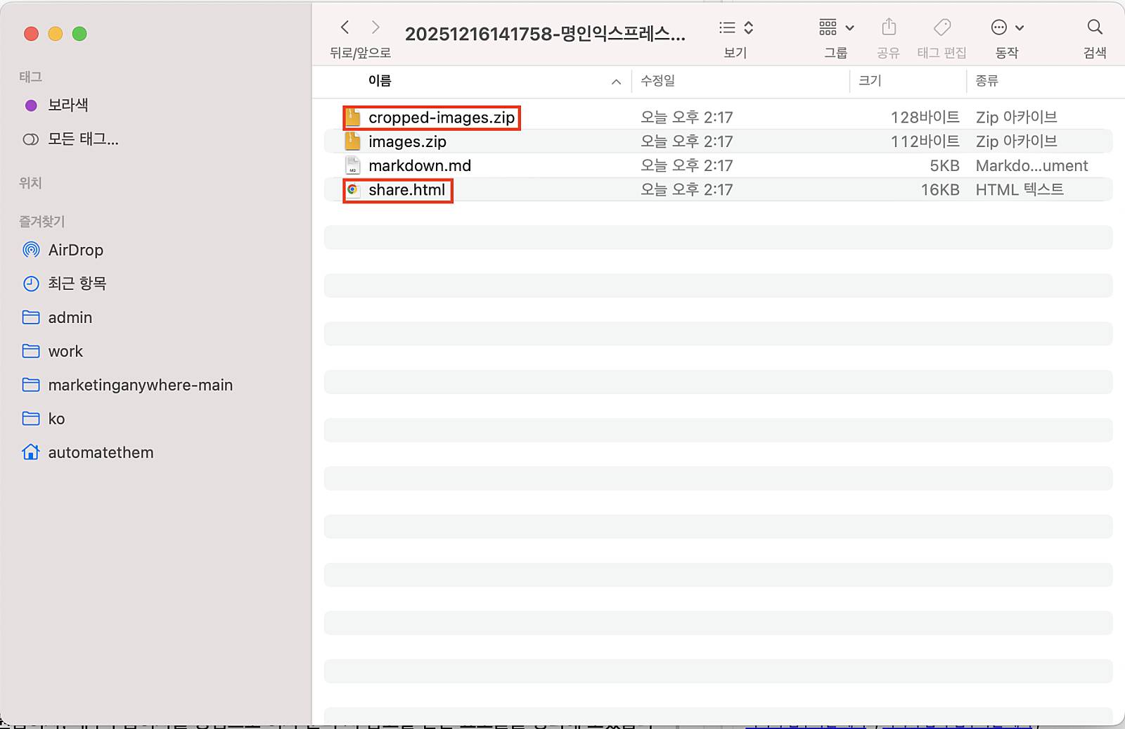 블로거에게 블로그 글 복사·붙여넣기를 의뢰할 때는, 압축 해제 후 생성되는 share.html(마크다운 공유 주소) 파일과 cropped-images.zip(이미지 처리 파일, 랜덤 크롭·밝기 보정·JPEG 압축 적용)을 전달하면 됩니다.
