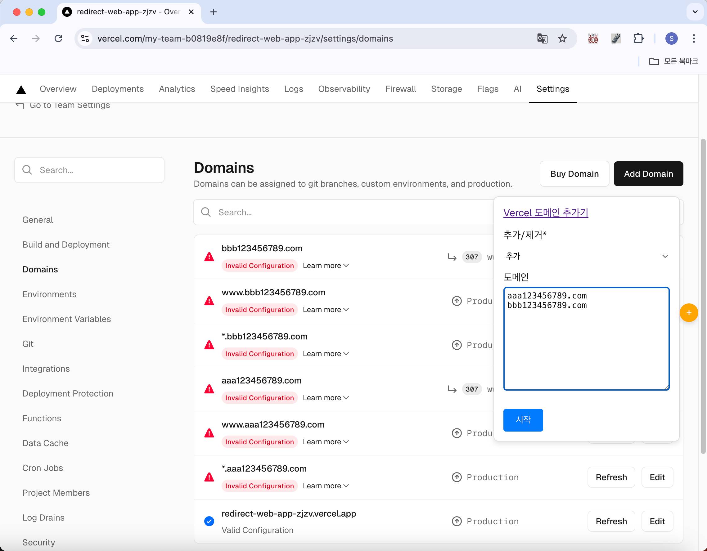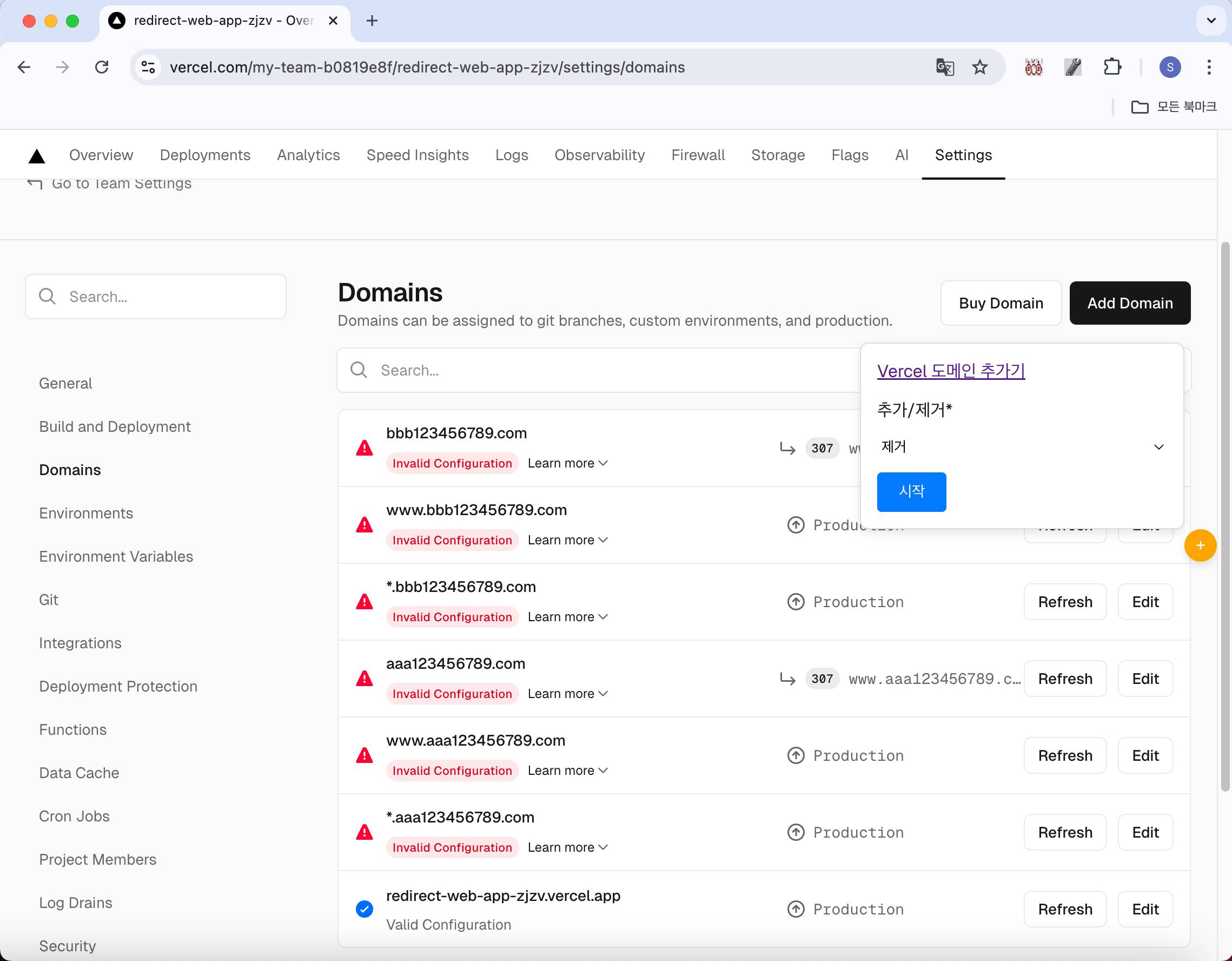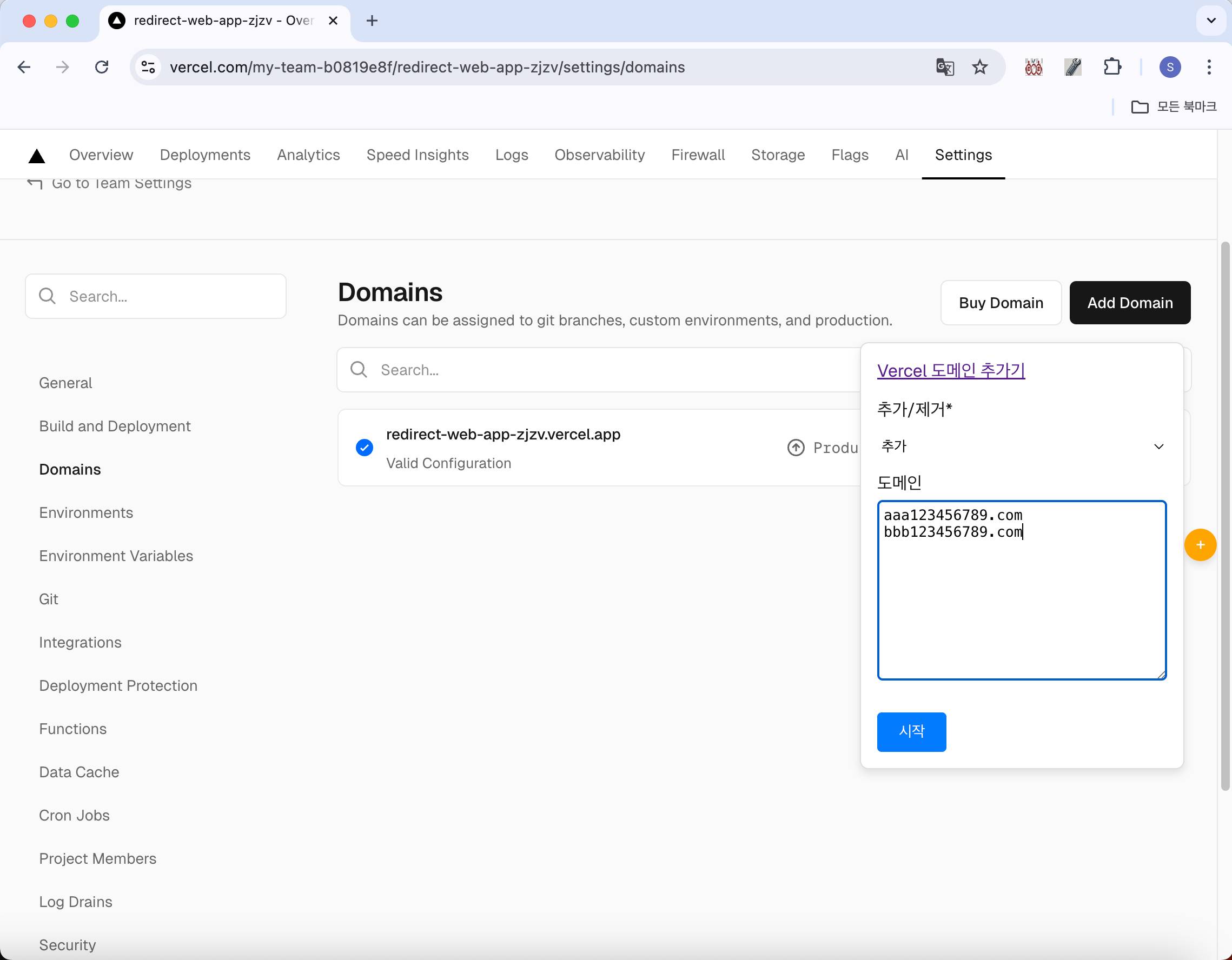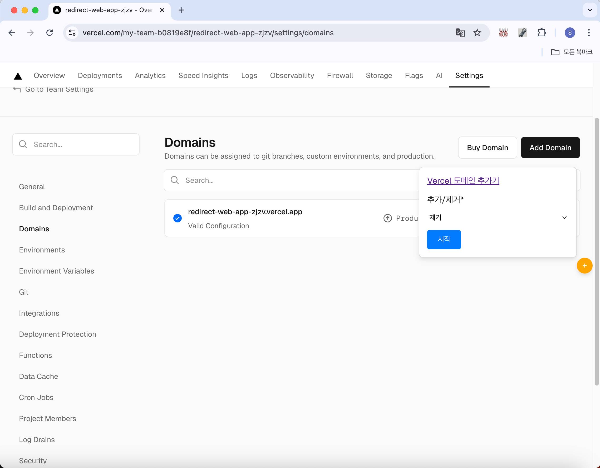 Vercel 도메인 추가기는 https://vercel.com/ 의 특정 프로젝트 - Settings - Domains 메뉴에서 도메인을 추가, 삭제해 주는 브라우저 확장 유틸리티 입니다.