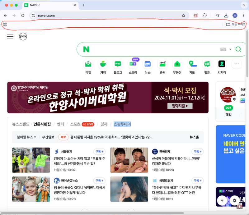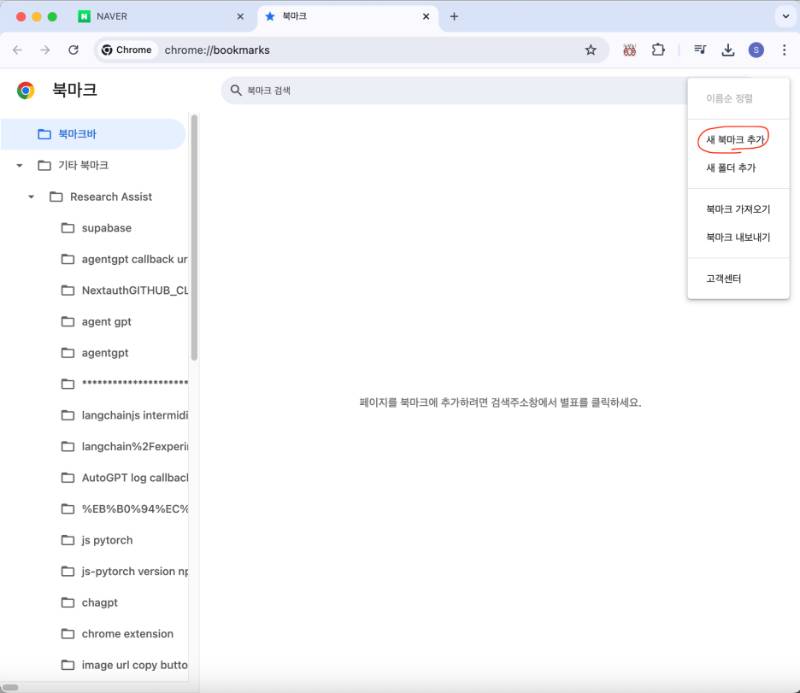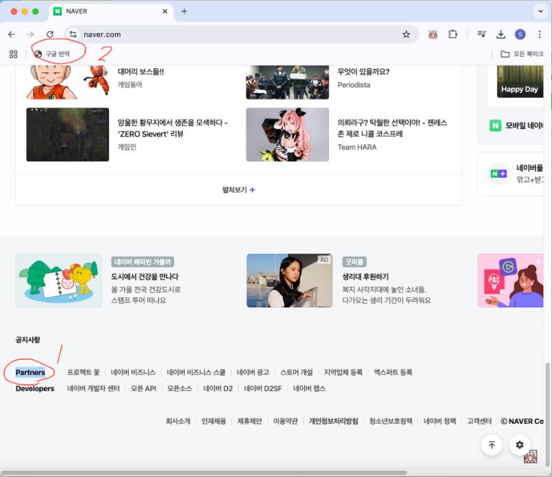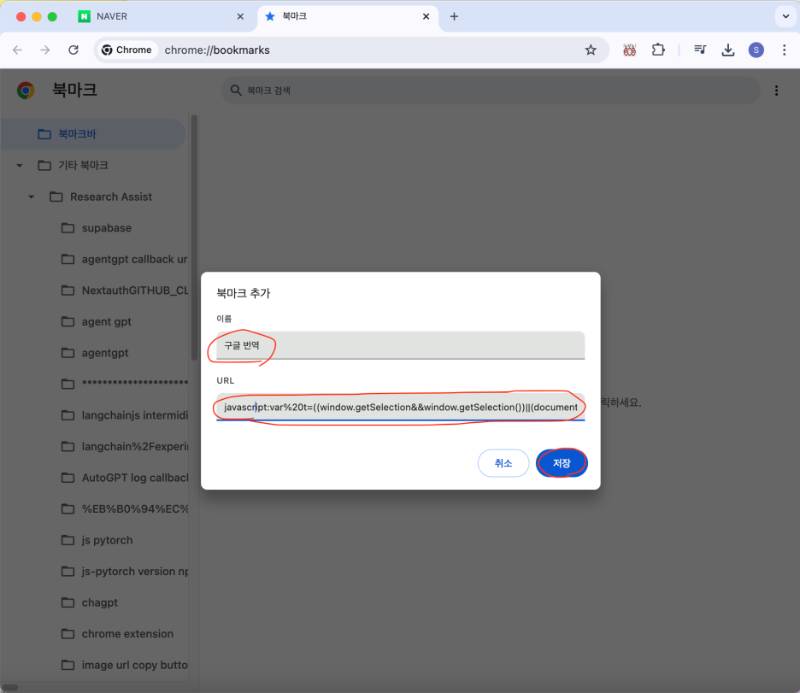 특정 글자를 선택후 추가된 구글 번역 북마크 버튼을 누릅니다