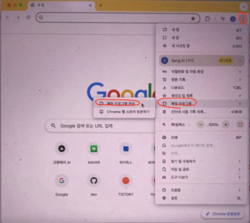오른쪽 상단 점 세 개를 클릭하여 확장앱 관리자로 이동합니다.