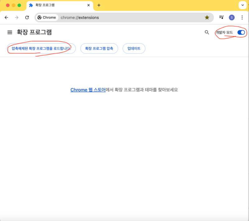 “압축해제된 확장 앱 설치”를 클릭합니다.