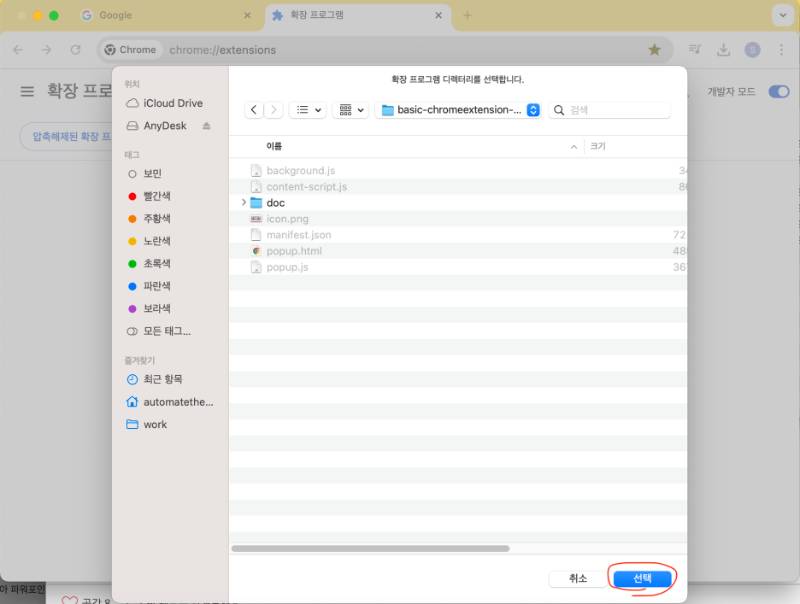 확장 프로그램 소스 파일이 압축되어 있다면 압축을 해제한 후 해당 폴더를 선택합니다.