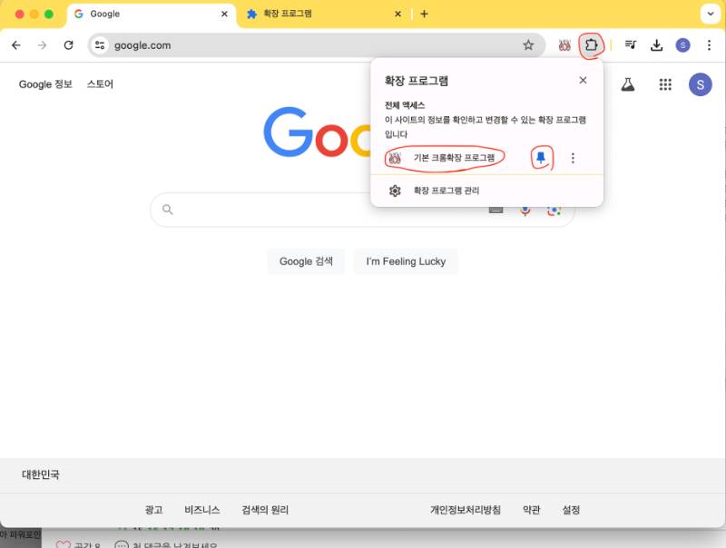 상단 퍼즐 아이콘을 눌러 확장을 실행 합니다. 핀을 눌러 확장 아이콘을 상단에 고정 할 수도 있습니다.