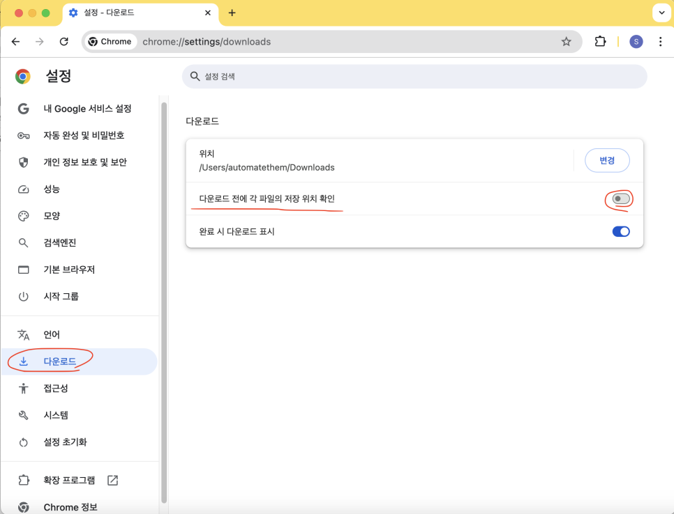 2."다운로드 전에 각 파일의 저장 위치 확인" 체크 해제
