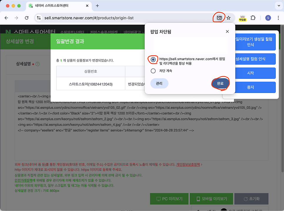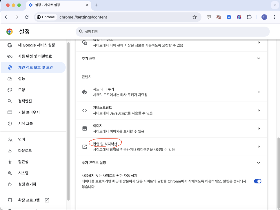 1.팝업 허용: "팝업 및 리다이렉션을 항상 허용" 선택