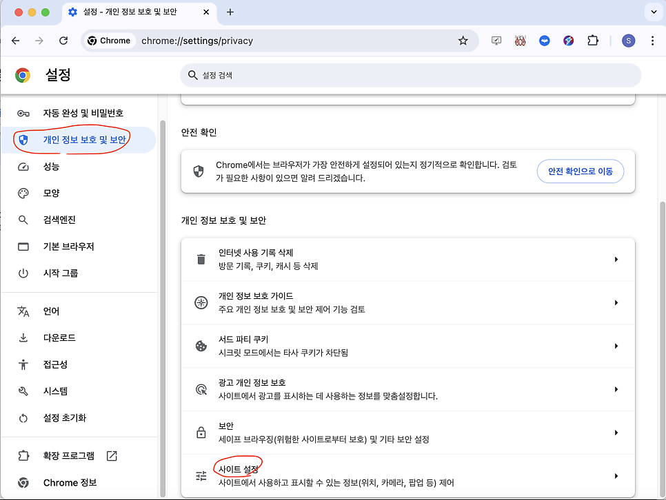 2.2.개인 정보 보호 및 보안 - 사이트 설정