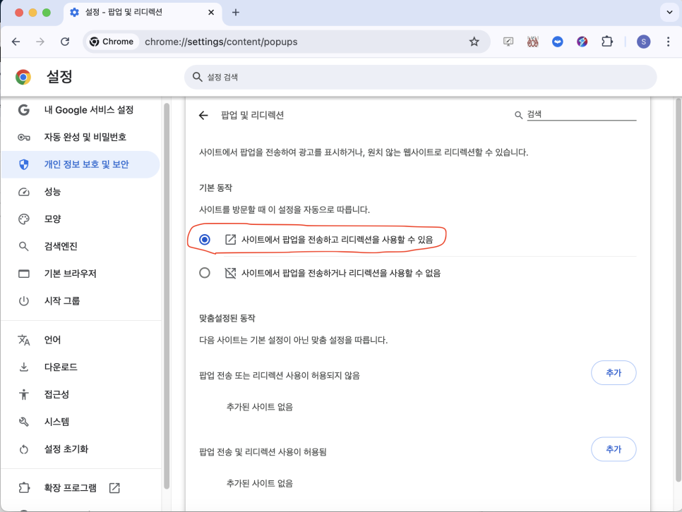 1.팝업 허용: "팝업 및 리디렉션 허용" 선택